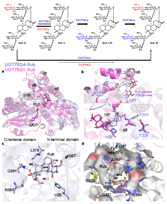 为了阐明UGT76G4不同于UGT76G1的底物区域选择性的分子机制,作者解析了UGT76G4-UDPG和UGT76G4-Rub(悬钩子苷,Rubusoside)的晶体结构(原文图3),发现与之前文献报道的UGT76G1-Rub晶体结构中Rub所呈现“竖直”状态的构象不同,Rub在UGT76G4的底物结合口袋内折叠成U型,呈“平躺”状态,与UGT76G1复合体中的Rub成103度旋转,且C19位糖基处于催化位置,与催化残基His25形成氢键。Rub在UGT76G4底物结合口袋采取这种构象主要是因为G200残基没有侧链,增加了空腔内部空间大小。